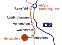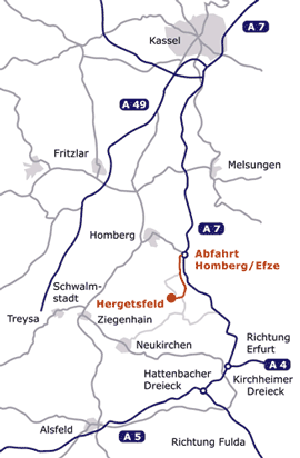 Autobahnabfahrt Homberg/Efze, über Remsfeld und Reddinghausen Richtung Völkershain, in Völkershain rechts Richtung Schwarzenborn/Hergetsfeld, weiter über Wallenstein und Appenfeld nach Hergetsfeld